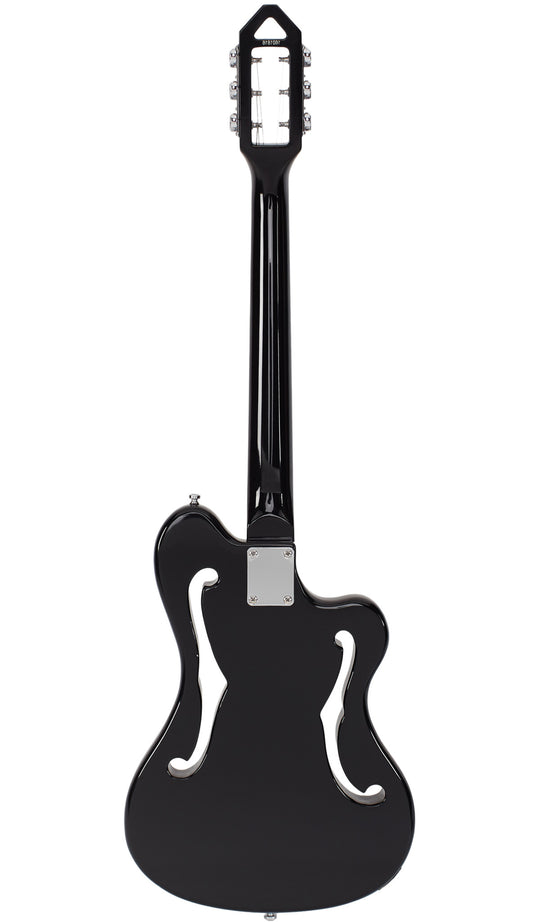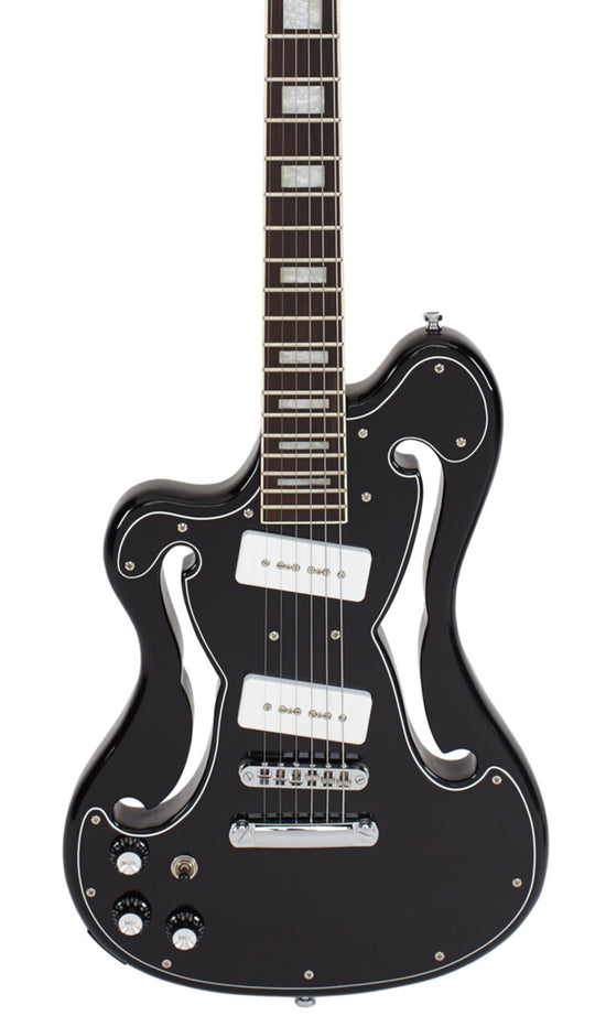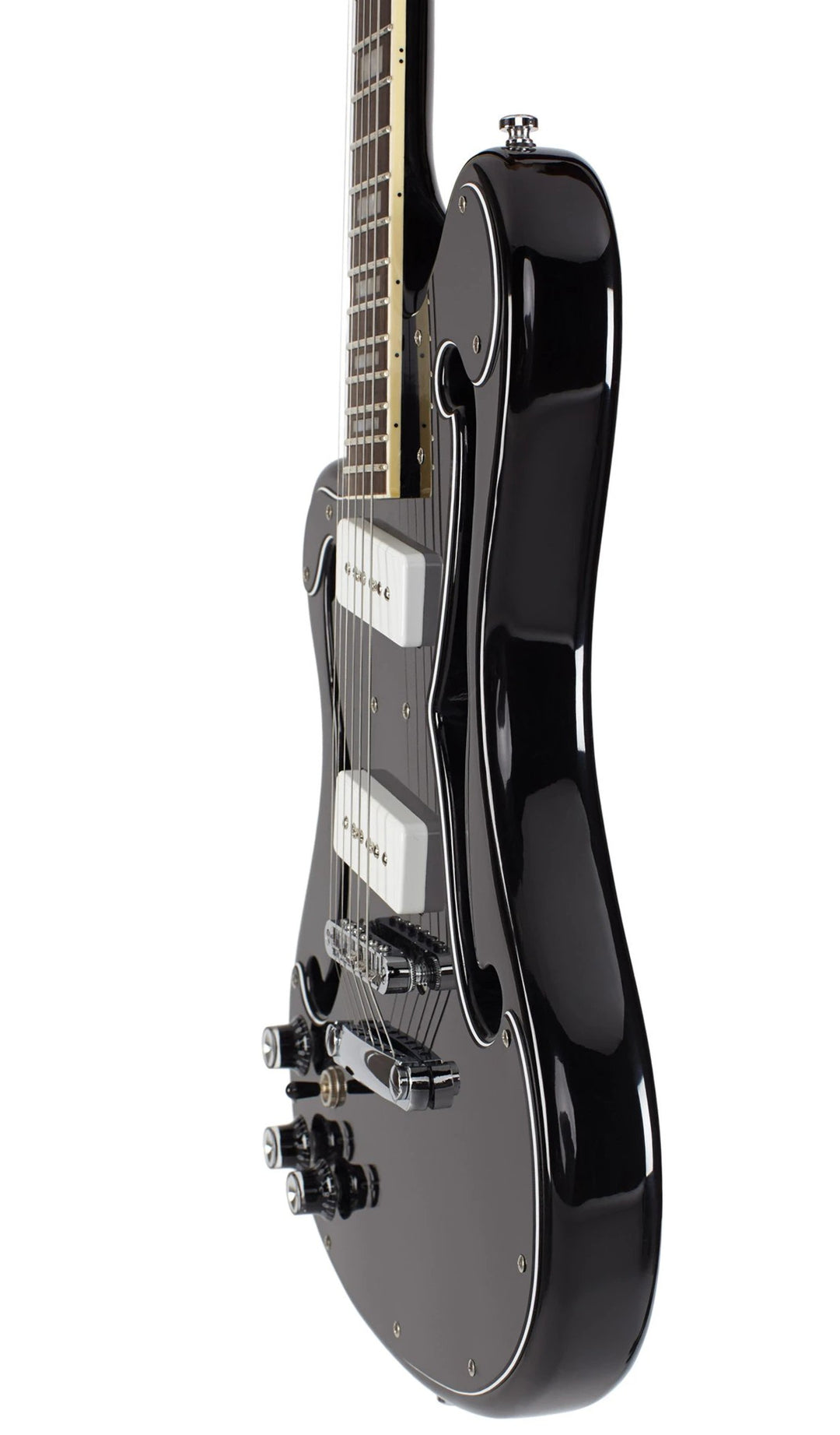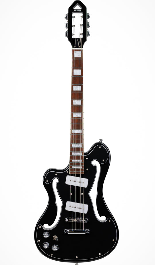 The EEG (Eastwood Electric Guitar) is a tribute to the AMPEG AEB model from the late 1960's. Strange yet elegant, the EEG has a look like no other guitar. The F-holes are cut completely through the body for an unusual see-through look. This left-handed Deerhoof Signature model is available as-shown with stop-tail, or as a DLX version if you add the Les Trem Tremolo.