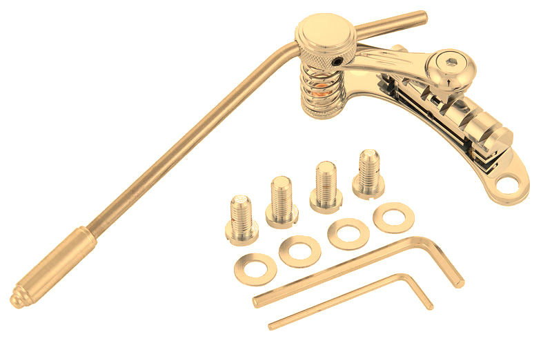 Vibrato system for guitars with Stop Tail Piece Mounts to the threaded collars on the Stop Tail Piece. Very simple installation, no drilling or milling required! Just screw tightly into the two existing threaded collars. This tremolo features a rounded arm for ideal handling.